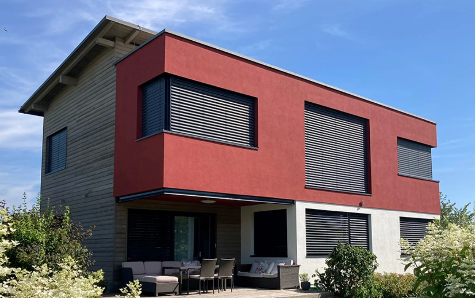 Haus mit roter Fassade und Holz Schalung