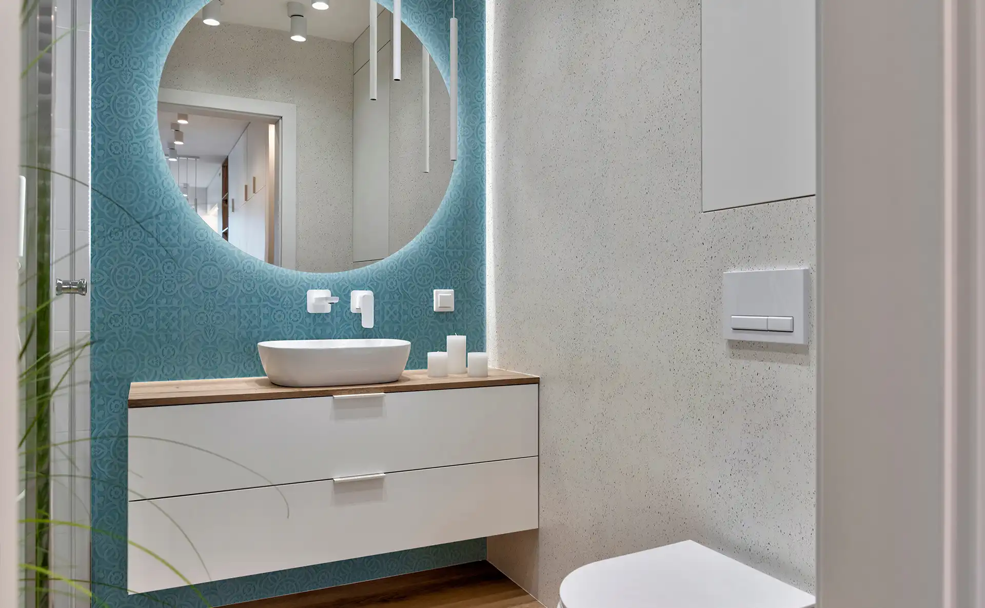Um das mediterrane Gefühl noch zu verstärken haben wir eine Schablonentechnik verwendet, die an Fliesenmuster im Mittelmeerraum erinnern. Kalkputze aus Löschkalk und ausgesuchten Marmorsanden erzeugen hier je nach Verarbeitungsweise matte, samtige oder glänzende Oberflächen.